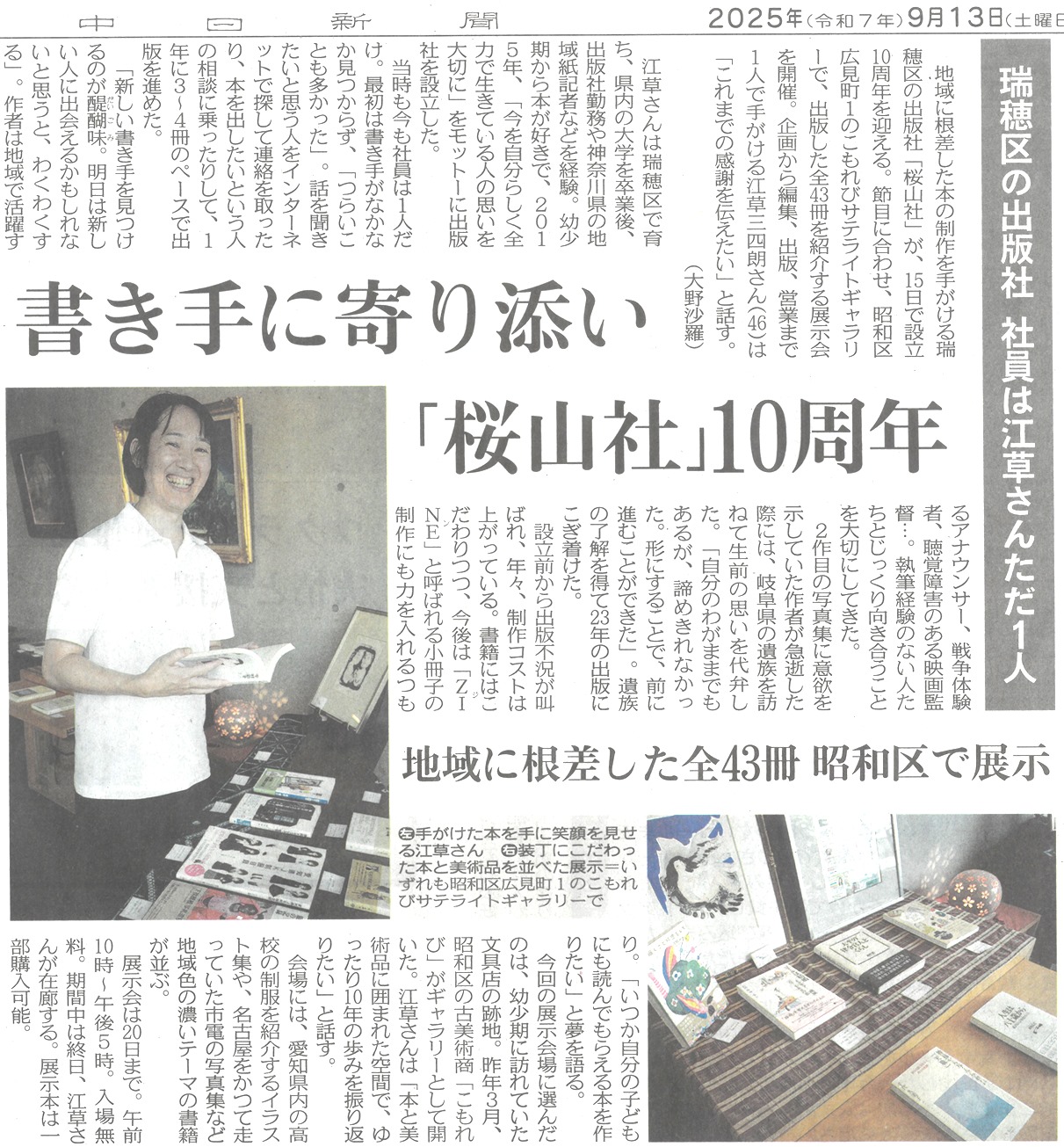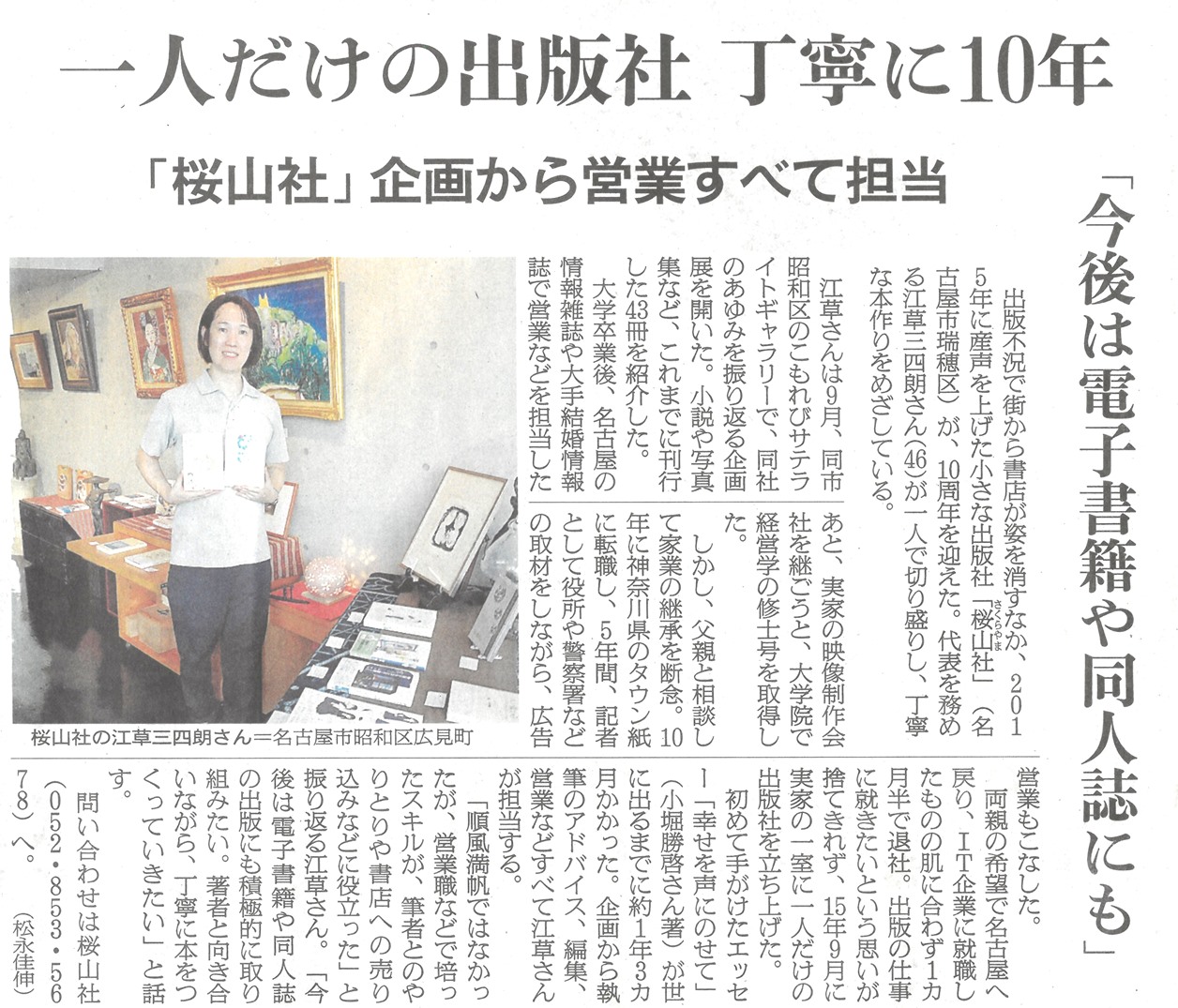 大学卒業後は、出版社での広告営業、新聞記者をしていましたが、頑張っている人の思いをカタチにして届けたいという出版への情熱を捨てきれず、2015年9月、「今を自分らしく全力で生きている人の思いを大切に」をモットーにするちいさな一人出版社「桜山社」(さくらやましゃ)を地元の名古屋市瑞穂区で創業しました。桜山社は、桜山の地名から。